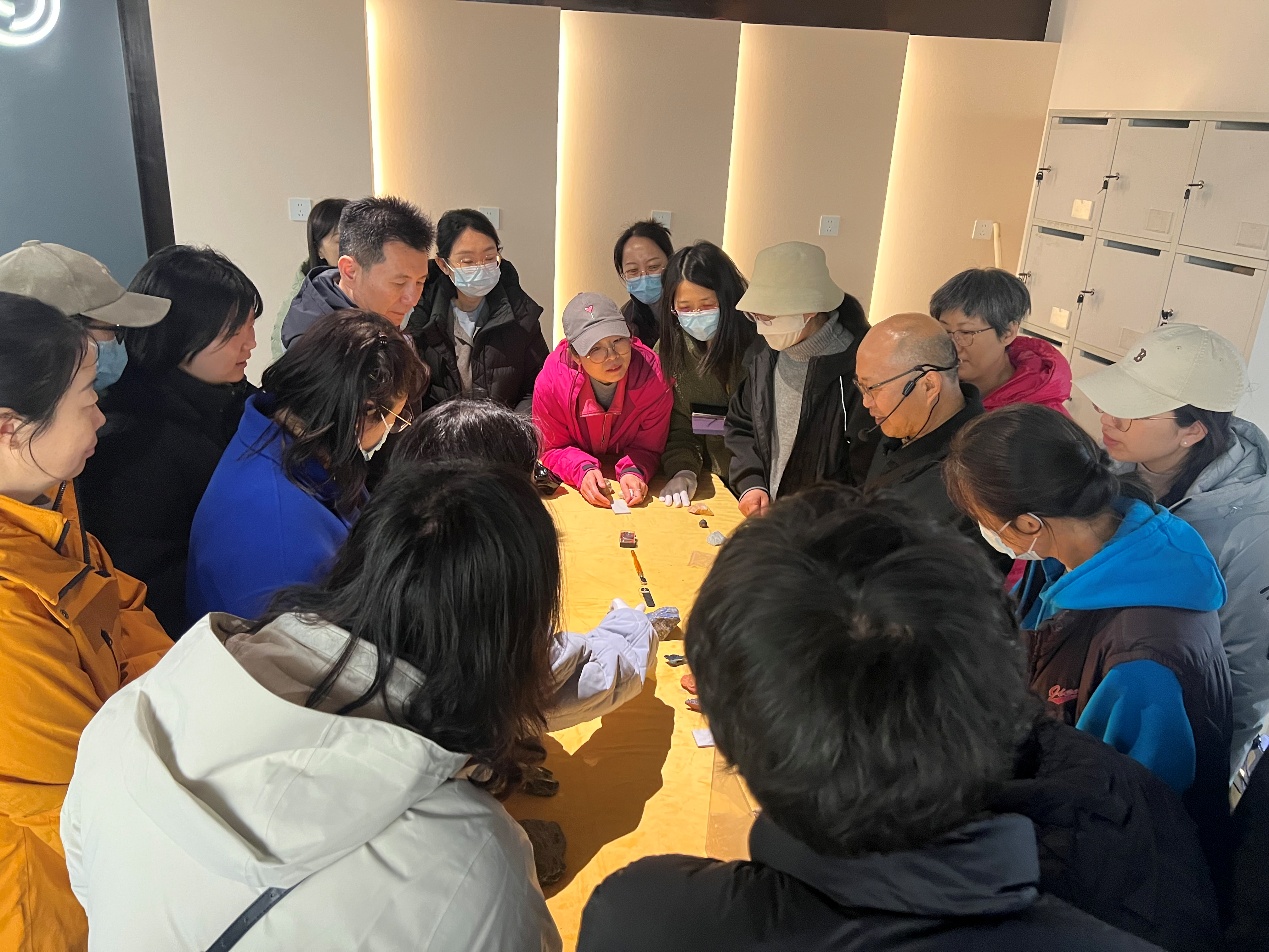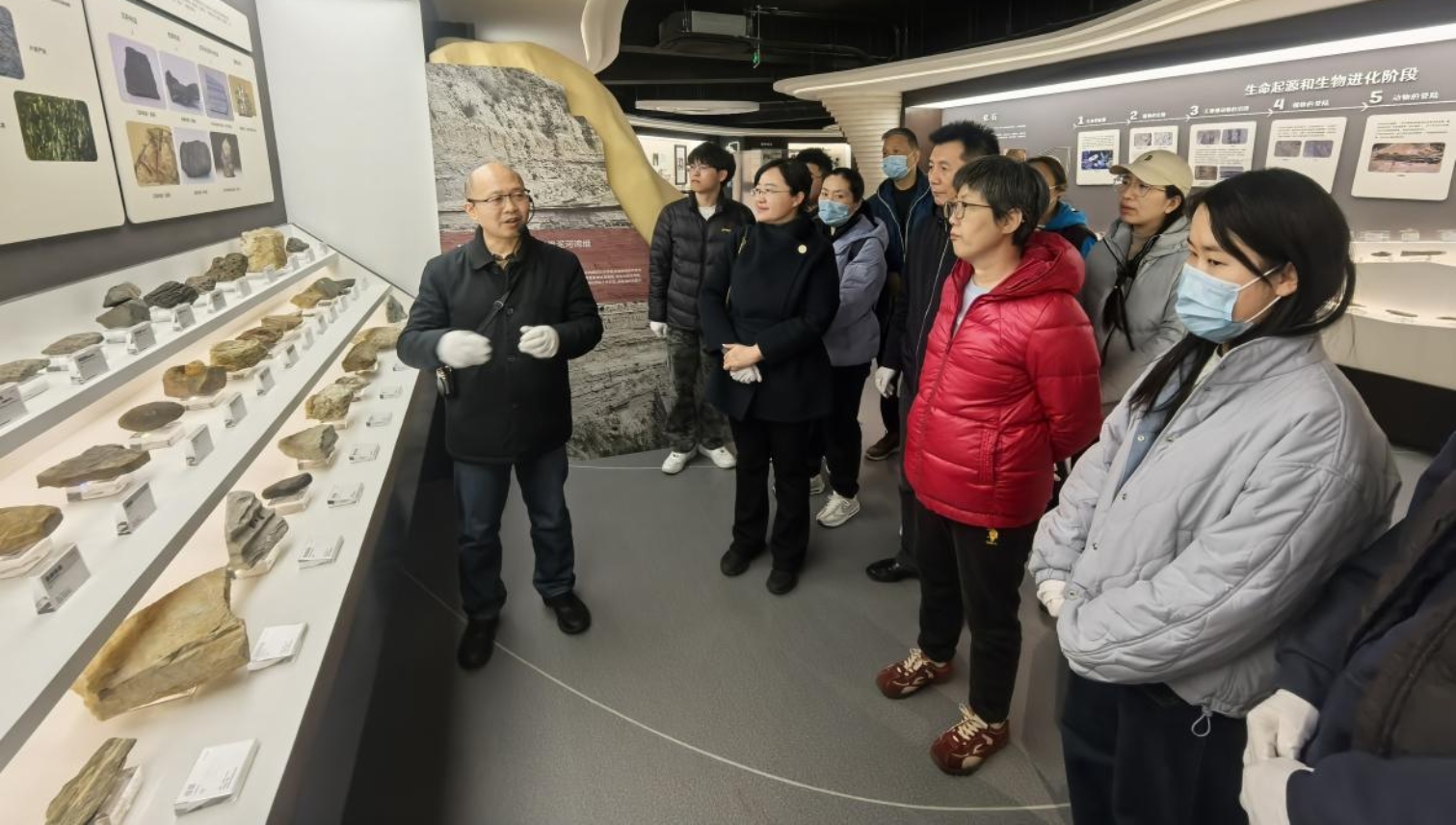参观活动由地质标本馆刘吉夫馆长亲自讲解。在馆长细致生动的介绍下,全体人员依次参观矿物区、岩石区、珍藏标本区、古生物化石区等展区,认真聆听地球演化、地质科考与我校地质学科发展历程讲解,近距离观赏珍稀标本,了解标本背后的科学故事,直观感受地质科学严谨求实、深耕细作、久久为功的科学精神。