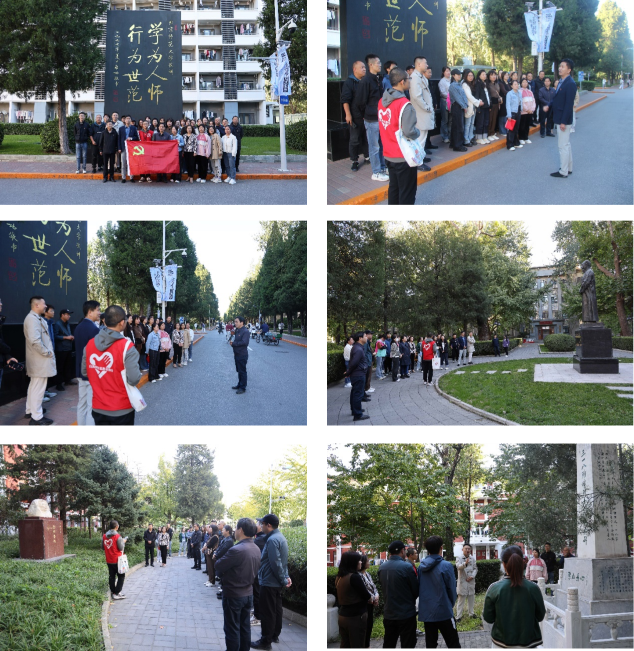 通过讲解员的精彩讲解,大家深入学习了北京师范大学的校史沿革,了解到北师大始终与民族解放、国家富强、社会进步紧密结合,领会了鲁迅、陈垣、启功等先师的精神力量,感悟了缪伯英、刘和珍、五四运动八勇士、“一二•九”运动先驱等革命志士体现的师大红色基因。一座座矗立在校园里的历史纪念碑和革命先驱的雕像,带领大家穿越时空,回到那个激情燃烧的年代,感受革命先辈们的英勇无畏和坚定信念。大家在参观过程中相互交流、相互学习,通过分享自己的感悟和体会,更加深入地理解党的历史和党的精神,进一步坚定自己的信仰和追求。