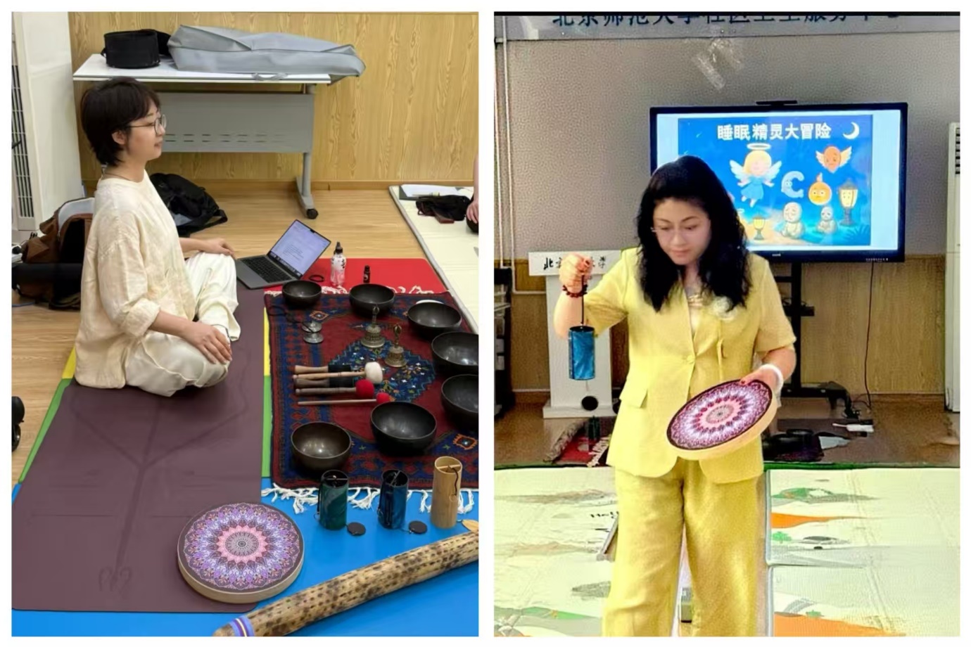 活动由校医院精神心理门诊的余倩医生带领,通过戏剧疗法重塑失眠者对失眠问题的认知,为活动参加者带来了全新的体验。活动还结合瑜伽、颂钵及中医经络疗法,从身心和谐的角度为参与者量身定制个性化身体放松与修复方案,并运用了人工智能工具将失眠问题可视化,使失眠者能更深入地理解和应对失眠状态。活动现场气氛平和安静,参与者充分沟通、情绪舒缓。