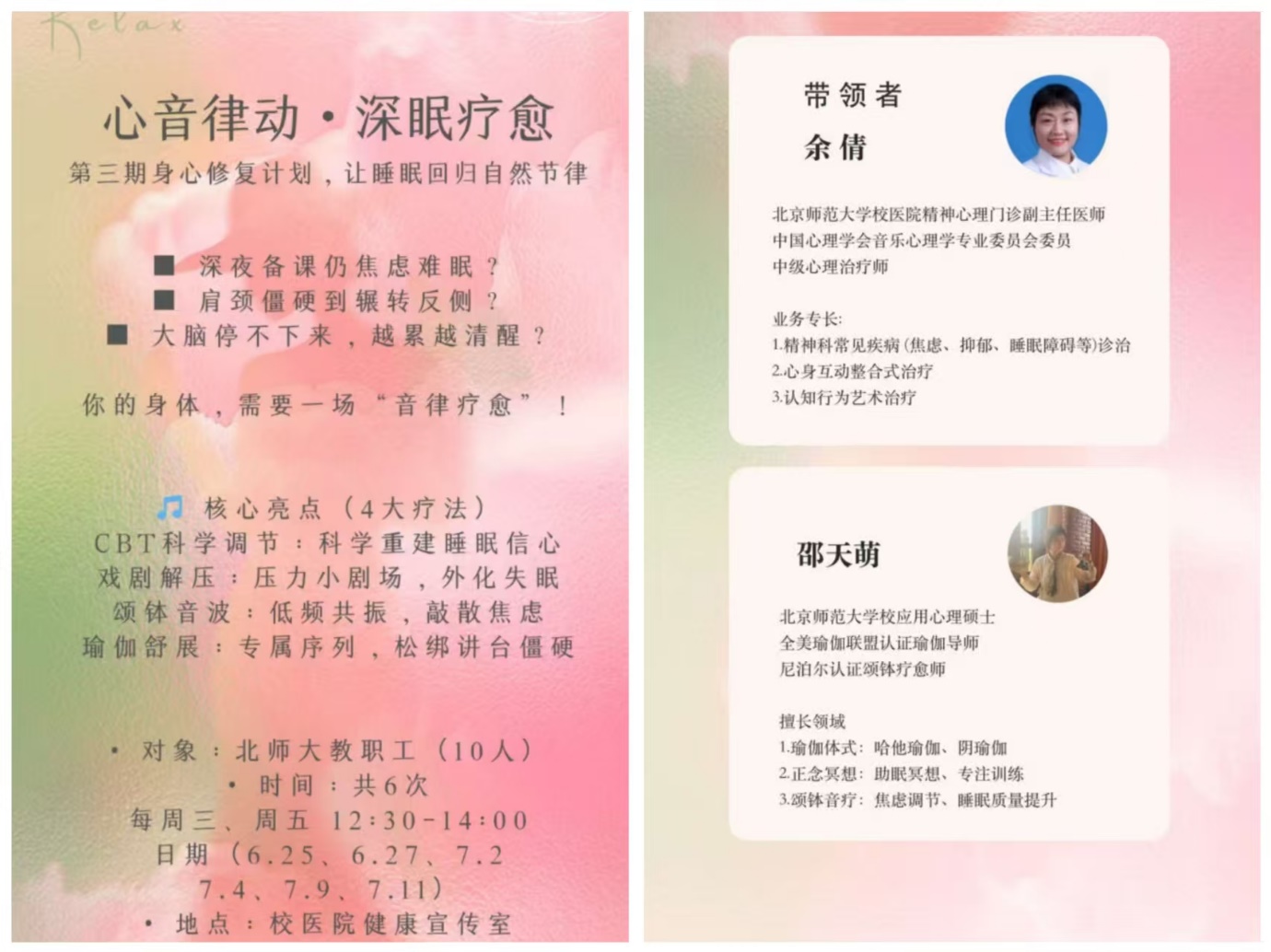 为关心关注我校教师的身心健康,更好地保障教师工作和生活质量,校医院与校工会职工心灵驿站联合举办了失眠团体疗愈活动——心音律动 深眠疗愈,引入创新诊疗干预手段,为教职工带来“深夜好眠”体验。