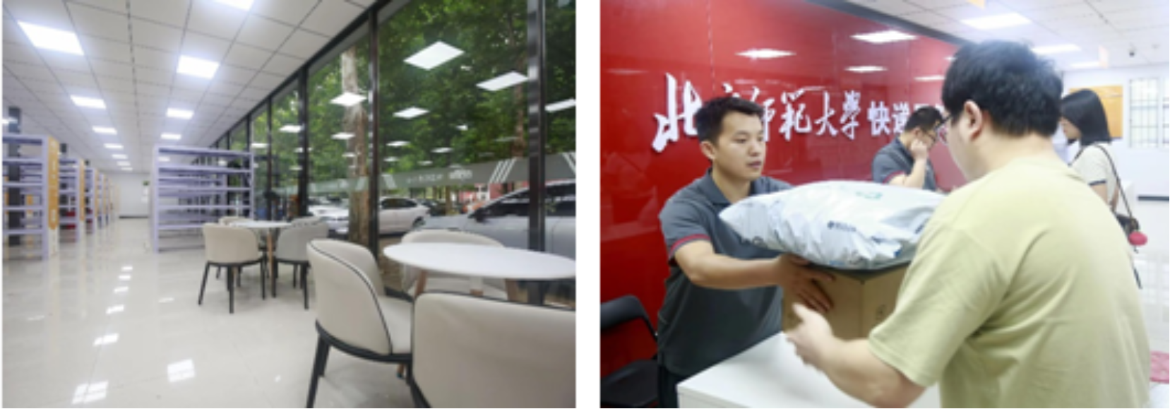 此外,快递服务中心还精心打造了“暖心服务区”,设置学生休息区,摆放书架与各类图书,营造出独特的“书香快递”氛围,舒适的桌椅可供等候取件的师生短暂休憩。