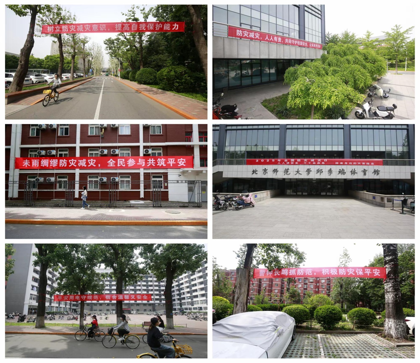 1、条幅宣传。5月12日至18日,在教学楼、食堂、宿舍区主干道、操场围栏等人员密集且显著位置,悬挂以地震、火灾、防汛等防灾减灾为主题的宣传条幅。通过这种直观的视觉宣传方式,营造出全方位、多层次的“防灾减灾”宣传氛围,切实增强了全体师生、员工“防灾减灾”的使命感和责任感。